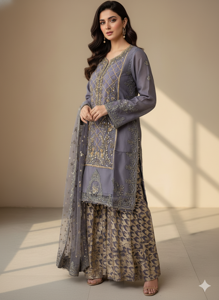 Grey-Blue Embroidered Sharara Suit | 3 Piece Stitched